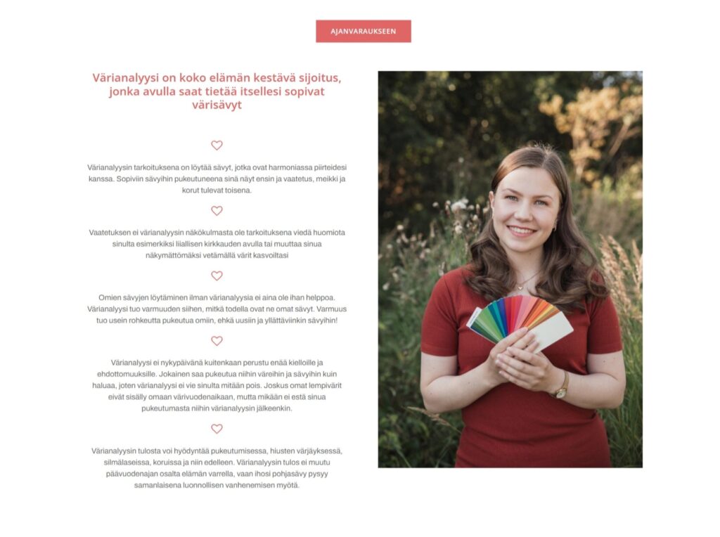 Yrittäjän selkeä visio raikkaista, ajanvaraukseen ohjaavista verkkosivuista kävi toteen kevyellä WordPress verkkosivutoteutuksella.